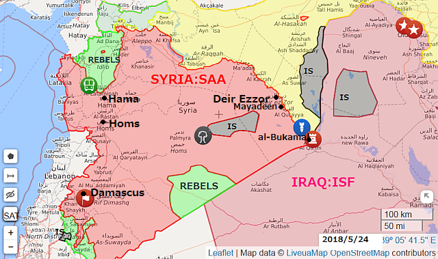 2018年5月27日:デリゾールDeir Ezzor近郊、マヤディーン Mayadeen( al-Mayadin)西部のシリア軍の砲撃基地を狙ったISの大規模な攻撃が23日発生し、監視兵員で派遣されていたロシア人9人とシリア政府軍の兵士26人が死亡、IS側は46人が死亡しISの装甲車6台が破壊されたと報告された。ISによるユーフラテス川沿いのマヤディーン方面への侵攻は幾度か報告されていて、戦闘はマヤディーンから西へ約40キロの砂漠地帯で発生している。24日未明には、米、有志国軍がデリゾールDeir Ezzor近郊やal-Bukamal付近でISへの空爆を行っている。右は、後日公開された軍事衝突の位置 参照記事 参照記事 参照記事 参照記事