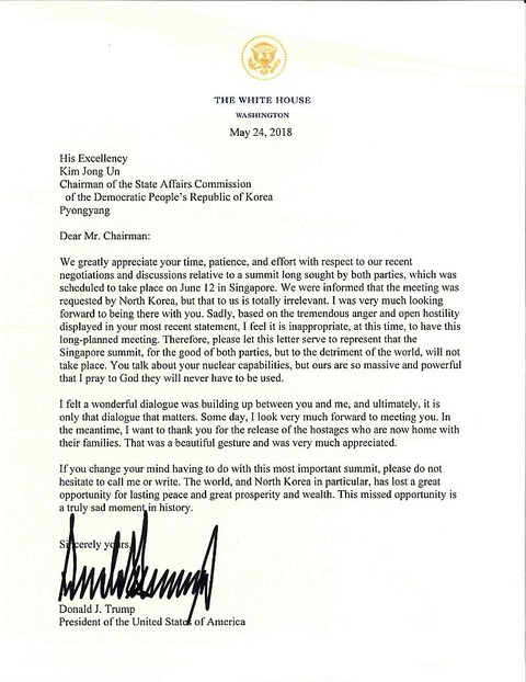 ブルームバーグ日本語版は2018年5月24日23時、トランプ米大統領は、6月12日にシンガポールで予定されていた北朝鮮の金朝鮮労働党委員長との会談を中止したと明らかにした。北朝鮮側の最近の「途方もない怒りとあからさまな敵意」が理由と説明し、同大統領が24日付で金委員長に宛てた書簡をホワイトハウスが公表した。書簡にはまた「貴方は自分の核兵器の能力に言及するが、我々のものは途方も無く巨大で、それらが使われない事を神に祈る」と書き添えていると英文記事にある。 参照記事 英文記事筆者は、米朝会談の話が出た時から否定的に見ていたので、この結果を意外とは思わないが、「売り言葉に買い言葉」とはいえ、随分とストレートに感情を表すんだなと思って記事と書簡を読んでいる。署名入りの書簡コピーが右で、確かに書いてある。思うに、5月22日に訪米した韓国大統領へのそっけない態度から、トランプ氏は22日以前に会談の延期、もしくは中止を韓国へ伝え、あわてた 文大統領は「一度自分の考えも聞いてくれ」と急遽米国へ飛んだ