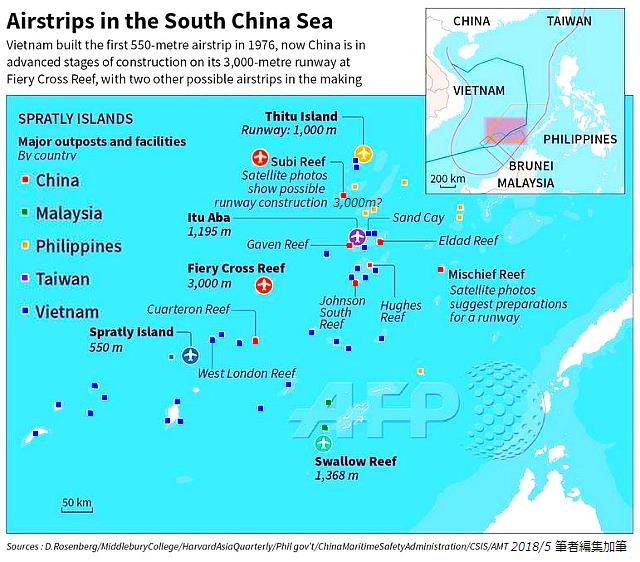 2018年5月18日、中国人民解放軍は、南シナ海の西沙諸島(パラセル諸島、Paracel Islands)の別の人工島であるウッディー島Woody Island 永興島:右 に建設した軍民両用の3000m級の滑走路に初めて爆撃機数機を着陸させ、戦略爆撃機H-6Kの離着陸訓練の映像を公開した。米戦略国際問題研究所(CSIS)の中国の専門家は「爆撃機が南シナ海(の島)に着陸したのは初めてだと思う」とツイートした。スービ礁にも建造されている3000メートル級の滑走路でも、こうした軍用機を離着陸させることが可能とみられる。
