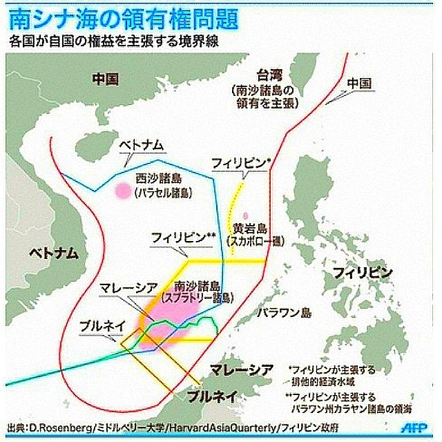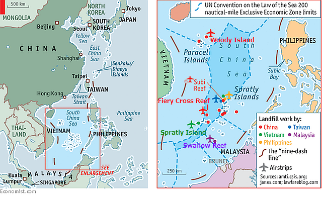 南シナ海は、世界の主要なシーレーンの一つでもあり、日本へ運搬される石油タンカーや物資を運搬する航路でもある。多くの天然資源を有する係争地域として、中国のほか台湾、ベトナム、マレーシア、フィリピン、ブルネイの6カ国が領有権を主張している。左上の右図は、国連の定める国連海洋法条約による200海里経済的排他的地域(漁業権益圏) UN Convention on the Law of the Sea that the 200 nautical mile exclusive economic zoneの区割り。これによれば、中国の人工島は、中国本土から200海里内のパラセル(西沙)諸島Paracel Islandsウッディー島Woody Island以外は公海上に在ることになり、各国が中国の軍事基地建設を非難する根拠となっている。米軍はこの海域(公海)で「今後も国際法を順守しつつ航行の自由作戦を継続していく」と述べている。