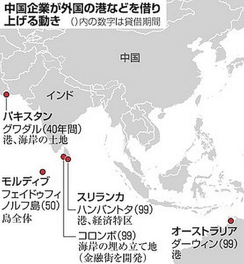 左下は、米国務省の政策立案のためにハーバード大学の研究者が2018年3月にまとめた論文で、中国の過剰な資金貸し付けによる「債務帳簿外交debtbook diplomacy」の危険にさらされていると指摘した16カ国(赤い丸)と、中国が99年間借り上げたオーストラリアのダーウィンDarwin港の位置 英文記事 英文記事 過去ブログ:2018年5月マレーシア新政権 中国との鉄道計画全面中止と見直しを発表 2月インド洋、南太平洋での中国の経済侵食に警戒感 2017年12月豪州政界へ癒着する中国>議員辞職へ 2017年8月中国の経済支援でスリランカは財政破綻の危機?
