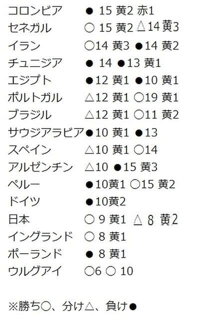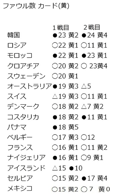 韓国の2戦目対メキシコのサッカー対決が終わったが、ファウルとイエローカードで見てみれば、韓国チームのファウル数とイエローカードは6月24日時点で世界一。右は、筆者が一部編集した一覧で、左の縦が第1戦、その右が第2戦のファウルとイエローカード数。丸は黒丸が負け、白丸が勝ち。