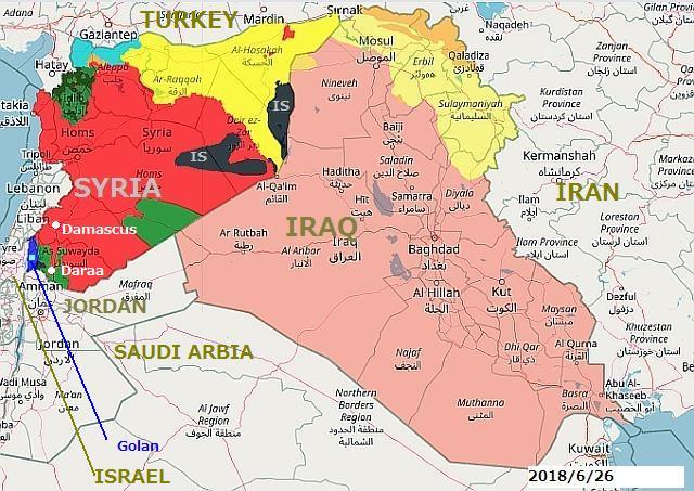 シリア政権軍は、ハマHama北部、シリア南部ダルアーDaraa (Dar'a, Deraa, Dera)地域、デリゾールDeir Ezzor東部からイラク国境までの反政府側、IS攻撃を継続している。ダルアー県の Basr al-Harir(Busra al-Harir付近では26日に政府軍の大規模な砲爆と空爆攻撃があり、約45000人の住民がヨルダン側などへ避難したと報道され、ヨルダンはシリア軍、避難民、負傷兵らの越境入国を防ぐ為ダルアーに近い国境沿いに戦車や兵員を配備していると言われる。シリア軍は、クネイトラQuneitra(Al Qunaytirah)、ダルアー県南部 the southern provinces of Dera、Basr al-Harir、Sweidaから完全に反政府派を排除する作戦だと指摘されている。過去ブログ:2017年12月ゴラン高原、非武装地帯に舞うシリア国旗 英文記事