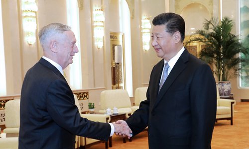マティス米国防長官は2018年6月27日、訪問先の北京で、習近平国家主席(中央軍事委員会主席)らと会談した。ロイター通信によると、マティス氏は米中両軍の対話の重要性を指摘。両国は通商や南シナ海で対立するが、米国は北朝鮮を非核化denuclearizationにする目的の制裁継続に中国の協力を必要としており、協調ムードを演出した形だ。中国中央テレビによると、習氏は会談で「中米関係は世界で最も重要な2国間関係の一つ」と協力の必要性を強調し、マティス氏も「両軍の関係は、米中関係において極めて重要だ」と応じた。一方で、習氏は南シナ海や台湾の問題を念頭に「主権と領土を巡る問題で我々の態度は断固としている」と米国にくぎをさした。長官はこの後、韓国、日本を訪問する。参照記事 英文記事 写真:Chinese President Xi Jinping (right) shakes hands with US Defense Secretary James Mattis at the Great Hall of the People in Beijing on Wednesday