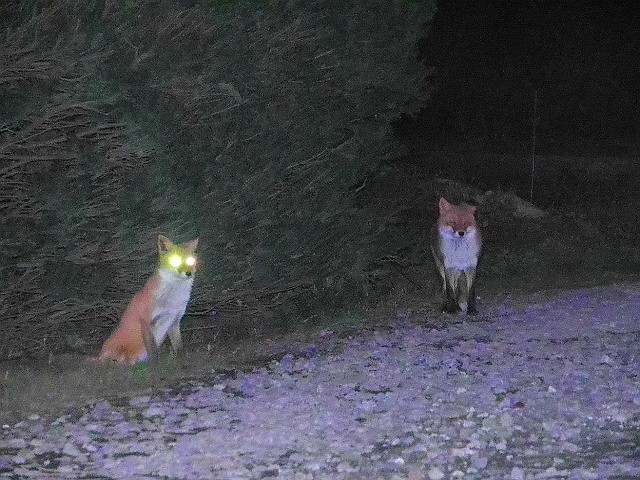 日没が早くなり、曇り空のせいか、5時でもうす暗くなって来たのでフラッシュを使って写真を撮った。暗がりで光に反射する目が光って写っているのがママさんだろう。2匹が食べ終わるころ一番小柄なのが現れた。まだ筆者には充分には慣れていない。今日2018年10月24日は、キツネたちにとっても筆者にとっても記念すべき日になった。