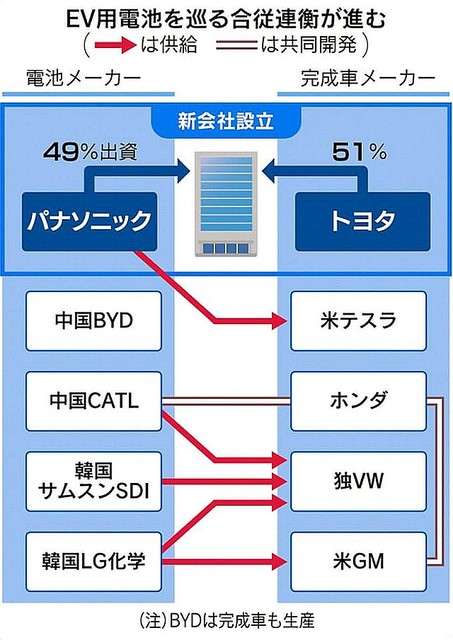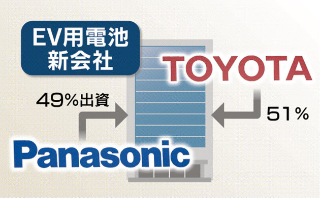 トヨタ自動車とパナソニックが、2020年に電気自動車(EV)などの車載用電池を開発、生産する新会社を共同で設立する方針を固めたことが20日、分かった。普及が見込まれるEVの競争力を左右する電池で協力し、影響力を強める中国勢や韓国勢に対抗する。週内にも発表する。新会社にはトヨタが51%、パナソニックが49%を出資する方向で調整している。両社は業界ナンバーワンの車載用角形電池の実現を目指し、充電時間が短く、走行距離を飛躍的に延ばすことができるとされる全固体電池を共同で開発。パナソニックが兵庫県と徳島県、中国に持つ5カ所の車載電池工場の生産設備は新会社に移管する。参照記事