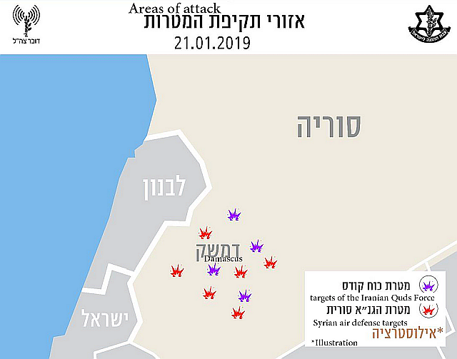 これに対してシリア国営シリア・アラブ通信(SANA)は、「イスラエルの空爆」を迎撃したと伝え、シリアの防空システムは「イスラエルの攻撃」に対抗し、「目的達成を阻止した」と報道。同通信は「我々の防空システムは状況に対応し、敵対ミサイルのほとんどを迎撃した」と伝え、被害者の有無には言及しなかった。右図は、2018年12月のIDF攻撃地点