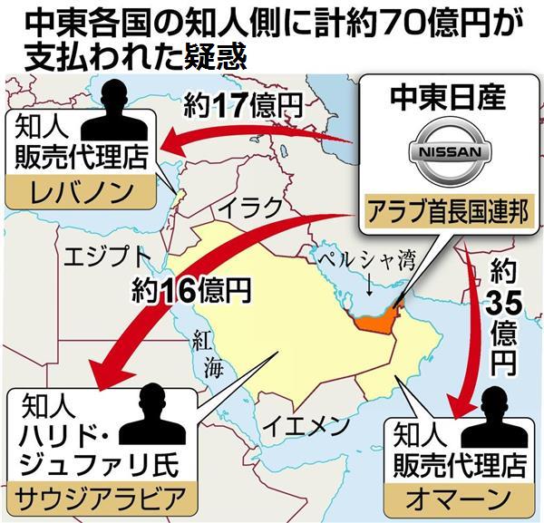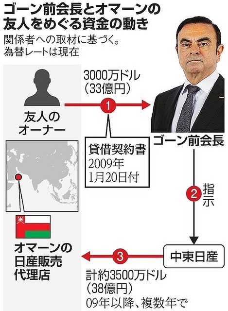 ゴーン前会長は2019年1月11日、約13億円(現在のレートで16億円?)をサウジアラビアの実業家、ハリド・ジュファリ Khaled Juffali 氏へ私的に送金したとして起訴されたが、他にも私的流用疑惑がある。前会長カルロス・ゴーン被告はオマーンの日産販売代理店のオーナーと長年の友人で、2009年1月20日付で、個人的に3千万ドルを借りる貸借契約書を交わし、私的に3千万ドル(現在のレートで約33億円)を借り入れ、この後に日産子会社から代理店に計約3500万ドル(同約38億円)を送金させていたことが、関係者への取材でわかった。原資はジュファリ氏への送金と同様、最高経営責任者(CEO)だった前会長が自由に扱えた「CEO予備費」で「販売促進費」名目で支出されという。前会長はこれらの送金について「不正な支出は一切ない」と否定している。