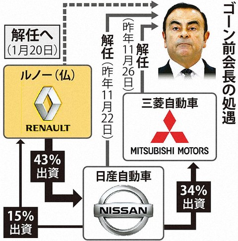 通しだと報じた。フランスのルメール経済・財務相:右 は1月16日、自動車大手ルノーの取締役会に対し、会長兼最高経営責任者(CEO)であるカルロス・ゴーン被告の解任に向けた取締役会の開催を要請し、ルノーはこれまで「推定無罪の原則」に基づきゴーン被告の解任を見送ってきたが、仏政府は勾留長期化を理由に「解任やむなし」と判断したとみられる。ルノーの筆頭株主は株の15%を保有するフランス政府。日産もルノー株を15%保有するが、ルノーは日産株の43%を保有し連結子会社にしている。 過去ブログ:2019年1月コラム:日産に必要なのは第2のゴーン、再建の道遠く 1月ゴーン容疑者の勾留取り消し請求が却下 ルノー従業員の反応