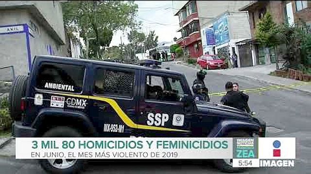 メキシコ国家公安システム(SESNSP)は、2019年6月は前半期で最も殺人被害者数が多い月だったと7月22日発表した。6月の殺人被害者数3080人は2018年7月の3158人に次いでメキシコ史上2番目に殺人被害者数の多い月となり、また2019年6月は、アンドレス マヌエル ロペス オブラドール(Andrés Manuel López Obrador)氏が大統領に就任(2018年12月1日)にして以来、初めて殺人被害者数が3000人を超えた月となった。ニュース映像