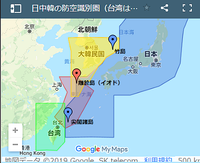 韓国合同参謀本部によると、2019年7月23日午前、ロシア空軍のA-50早期警戒管制機とTU-95爆撃機、そして中国空軍のH-6爆撃機など軍用機5機が東海の韓国防空識別圏(KADIZ)に無断進入する事件が発生した。この過程でロシアのA-50は独島(ドクト、日本名・竹島)近隣の韓国領空を2度にわたり7分間侵犯し、韓国の空軍戦闘機は領空を侵犯したロシアA-50の前方1キロの距離で約360発の警告射撃をした。韓国国防部は2013年12月15日午後2時から新しい防空識別圏(KADIZ)を設定しており、それを表したのが右上の左で、韓国の新KADIZ、さらに中国、台湾、中国、日本のADIZをGoogleMapに落としなおすと、右上の右の様になる。韓国主張のKADIZ内では、竹島を独島(ドクト)、南部のソコトラ岩 (Socotra Rock)を離於島(イオド)、または波浪島(パランド)と呼称し、自国領と主張しているが、中国主張の識別圏と重複している。参照記事 参照記事