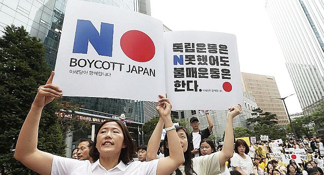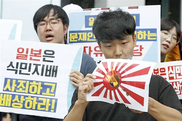 2019年7月31日:韓国大学生進歩連合한국대학생진보연합(大進連)の学生たちは29日午後、ソウル鍾路区(チョンノグ)の旧駐韓日本大使館前の少女像で日本の強制徴用謝罪要求および戦犯企業糾弾記者会見をしている間、旭日旗と安倍総理の写真を燃やしている。