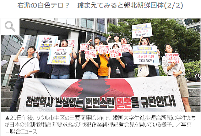 訪問を歓迎する「偉人出迎え歓迎団」の団長だ。韓国国内の親北・利敵団体は国民的な反日ムードに便乗する形で過激な行動に出ている。連邦制による統一、在韓米軍撤収、国家保安法廃止などを主張する「6・15共同宣言実践南側委員会」は8月15日、親北・反米・反日集会を一度に行う。光化門広場では民族統一大会、日本大使館前では安倍政権糾弾行動、米国大使館前では反米デモを予定している。参照記事 参照記事