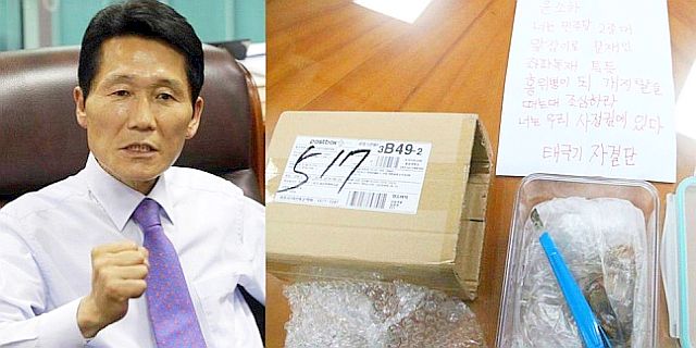 1カ月前の7月1日、革新系野党「正義党」の国会議員に、腐敗した鳥の死骸と凶器(カッターナイフ)が入った箱と共に「あなたは文在寅(ムン・ジェイン)左派独裁の特等紅衛兵」だという内容の非難・脅迫が赤文字で書かれた手紙が配達された。その内容から、左派文政権を非難する「右派団体の白色テロ:White Terror」という非難が集中した。ソウル・永登浦警察署は1日に「太極旗自決団」を名乗って鳥の死骸、カッターナイフなどを脅迫文と共に尹昭夏(ユン・ソハ 윤소하)正義党院内代表:写真右の左 へ送った疑いで、韓国大学生進歩連合(大進連)ソウル