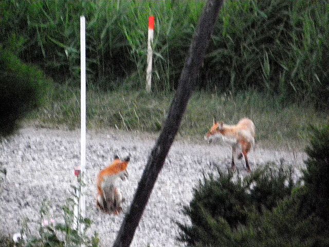 子ギツネの中でも、ひときわ小さいのが、まるで「怖がっていないよ」とでもいうように、勇気を振り絞り、すこし上目使いで近寄ってくる。他の子ギツネは周りからそれを「あのチビすごい!」と観察している。しかし、そんなチビも、他の人の気配がすると警戒して隠れてしまう。最近は、親たちが子ギツネを連れて狩り等を教えているのだろうか、夕方だけ、一緒に姿を見せるが、親が餌を運ぶのは続いている。恐らく、親が確認したものしか食べるなと教えられているのだろう。下2枚は、うす暗くなった中庭で遊ぶ子ギツネたちで、一匹はおなかを見せて転がっている。2階の窓から撮ったもので、色んな障害物のある中庭は良い遊び場のようだ。今年採取した糞の提出と新たな採取も終え、現在検査中だ。いつも時間厳守で餌場にきていたママさんの姿の確認できない日がある。子供が大きくなるとオスは巣を離れるとも聞いた。ママさんはオスだったのか?2019年7月28日:今日はいつもと様子が違う。ほぼ定刻にママさんと彼氏は餌場に来たが、いつもなら離れた巣の近くで遊びまわったり、最近は家の近くまで来て餌をねだる子ギツネの姿がまったく見えない。餌を巣まで何度も運んでいた彼氏の行動も変化して、餌は運んでいるが、巣とは別な方へ行き、隠してから戻ってきているのか、戻ってくるまでに随分時間がかかっている。以前なら子供に渡して、走って餌場に戻ってきていたのだが、、。今日は巣の近くに疑似餌を多めに撒いたばかりだった。すっかり暗くなってから餌を見ると、初めて餌が残されている。やはり、一家に何か変化が起きている。虫が集まるので、少し残して餌は回収した。夜中にママさんだけが必ず来て、ほかのキツネが食べないドッグフードを食べるのは分かっているので、ドッグフードの残る日が続けば、ママさんも我が家の縄張りを離れたことになる。今日は来ていたが、、。