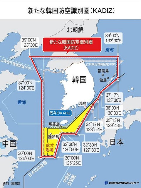 韓国側が公表した中国の軍用機2機とロシアの軍用機3機の侵入経路が左図で 参照記事 で、 防空識別圏(領空ではない)では、常時防空監視が行われ、(通常は)強制力はないが、あらかじめ飛行計画を提出せず、ここに進入する航空機には識別と証明を求める。さらに領空侵犯の危険がある航空機に対しては、軍事的予防措置などを行使することもあるとされている。