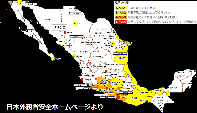 2923人、2月2877人、3月2943人、4月2806人、5月2979人、6月3080人で、今年1月から6月にかけて殺人事件が多かった州はグアナフアト州・メヒコ州・ハリスコ州・チワワ州・ゲレロ州で、右図の日本外務省の危険情報地図の中に、筆者が最近殺人多発する4つの州の位置を赤い角マークで記してある。