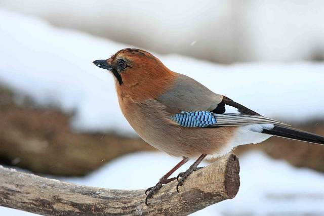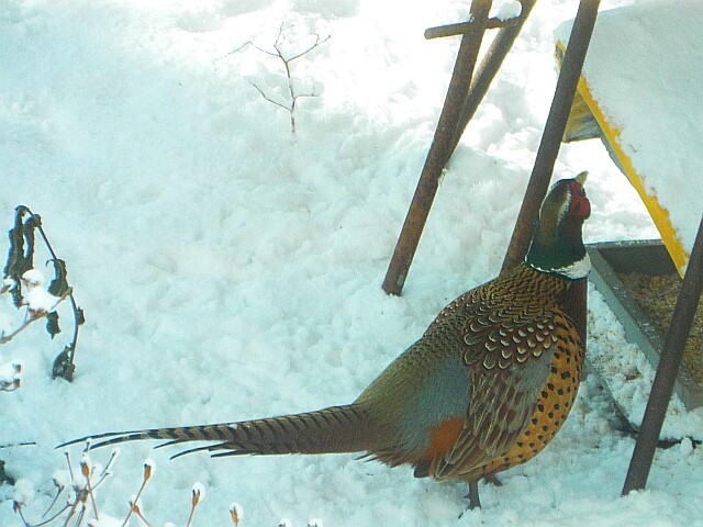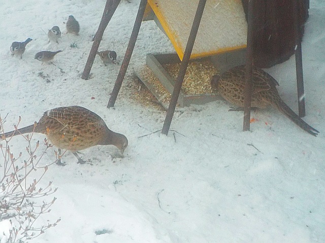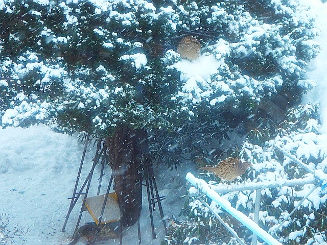 台へ飛び移り、やがて地上のオスと合流した。餌台は、キジ3羽、スズメ15羽ほど、カケス2羽が交互に餌を食べ、大賑(おおにぎ)わいだ。食後はオスの後を追ってメス2羽は庭の中を、一緒に木の芽などを啄(ついば)みながら雪の中歩き回り、垣根の下で休息に入った。その後メス2羽は、飛び立とうとしたのか庭の東側へ移動したが、雪が大降りになり、しばらく雪の上で休んでいた。左下、雪の中外で撮影11時10分。オスは西側の垣根下に移動。3羽とも、風雪で古巣へ戻るのを一旦諦めたようだ。