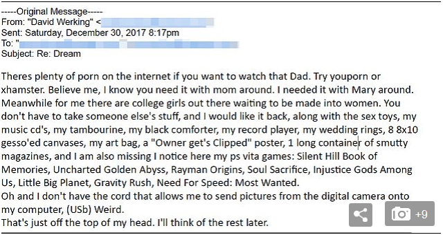 息子のワーキン氏 は離婚後10カ月間、ミシガン州グランド・ヘヴンにある実家で両親と同居。2017年8月に引っ越した。現在はインディアナ州で暮らしている。地元紙Holland Sentinelによると、同氏は裁判で、引っ越しの際に膨大な数の「替えがきかない」ポルノ雑誌やDVDなどを実家に残していったが、その後見当たらなくなったと主張。一方、両親は、息子が住むインディアナ州までポルノを運ぶ気はなかったし、自宅に置いておきたくもなかったと述べた。