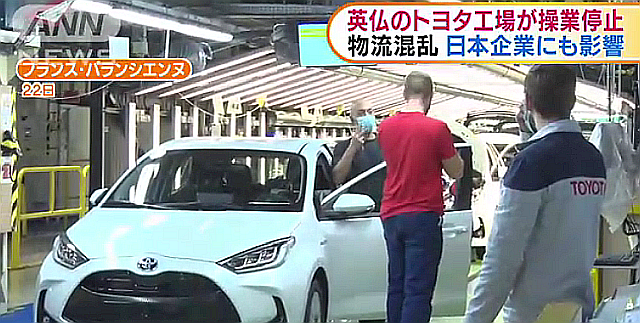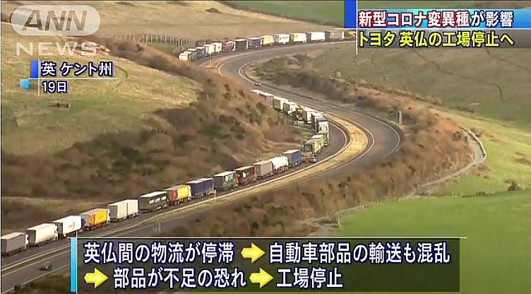 新型コロナウイルスの変異種の影響で、トヨタ自動車はイギリスとフランスの工場の操業を2020年12月22日から停止すると発表した。トヨタはイギリスのエンジン工場を22日から、完成車の工場は23日から操業を停止し、フランスにある工場も22日から閉じることを明らかにした。それぞれクリスマス休暇を前倒しにする形で、新型コロナウイルスの変異種が広がり「イギリスとフランスの間の物流が停滞し、自動車の部品の輸送にも混乱が生じている」として、今後、生産に必要な部品が不足する可能性があるため、操業の停止を判断したとみられる。物流の混乱が長引いた場合にはさらに影響が拡大する可能性がある。フランスでは2日間で2000台の生産に影響が出たということで、トヨタ自動車フランス、ジャン・クリストリフ・ドゥビルさん:「国境が開かない限り、生産を再開できません。状況が改善し、両政府が数時間で合意に至ることを期待しています」 参照記事 参照記事 日本時間、2020年12月23日、午前9:03報道 英国からの全ての入国を停止したフランスと英国の両政府が22日、封鎖の一部解除に向けた方策で合意した。英国のシャップス運輸相がツイッターで明らかにした。欧州連合(EU)欧州委員会は同日、加盟国に対し、孤立状態の英国からの旅客機や列車の受け入れ停止をやめ、物流を確保するよう勧告している。参照記事