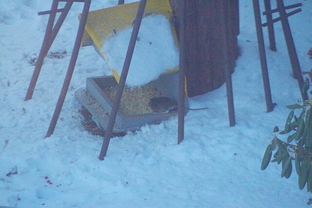 ありがたくも、今日も徳を一つ積ませてもらった。小鳥に混じって、小さめの野ネズミ一匹も餌場に来ていたのだが姿が見えない。元気なのかな?気の強いカケスが居ない、夜のうちに食べているのかもしれない。多分そうだろう。地下への入り口は、餌場から1.5mほどのところにある。下左に野ネズミが写っている。過去ブログ:2019年2月5日ぶりに戻ってきたキジたちとキツネのママさん2020年12月22日:午前8時過ぎ、中庭で朝を迎えたオスが先に、そしてメスが餌を食べ、オスは庭の垣根の下へ移動、メスは食後木の中へ舞い戻った。空は晴れで、気温は+2度で無風。暖かい朝だ。数十キロ離れた岩見沢では観測史上最多の約1.5mの積雪だが、札幌近郊は異常に降雪が少ない。昨日の夕方近く、野ネヅミも姿を見せ、餌を運んでいた。元気の様だ。