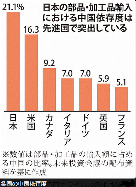 一方、今は紛争になっても戦争で解決する時代ではないため、経済力が最も強力な武器となる。日本とドイツが技術力を守って中国市場依存度を低くしようとしている理由だ。ドイツの立場では中国に対する輸出依存度が8%水準(右図では7% 参照記事)に止まっていることは幸いだ。30%を越えるオーストラリアや25%に達する韓国よりは中国経済の影響力が弱い。しかし日本は工業製品の部品・加工品など「中間財」の輸入で中国に依存する割合が20%を超えて先進国の中で突出して高く、新型コロナウイルスのような不測の事態が起きると部品の供給に支障が生じるため、自動車の製造に欠かせない重要な部品などは日本に生産拠点を移したり、供給不足になると国民生活への影響が大きい日用品などは、東南アジアなど他国に生産拠点を分散させて中国依存度を下げたりする方向