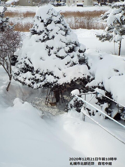 2020年12月20日:20日は朝から雪で、昼過ぎには20cmほど積もった。昼前に餌を食べているキジの2羽を確認したので、ここで夜を越したか、早朝にやって来ていたようだ。餌場の周りを除雪し、餌を補充すると、3時頃オスが餌を食べてから木の中に入った。恐らくメスも居て、今夜は2羽で木の中で過ごすのだろう。午後3時の気温はー3度で風は無い。今の時期としては暖かい。