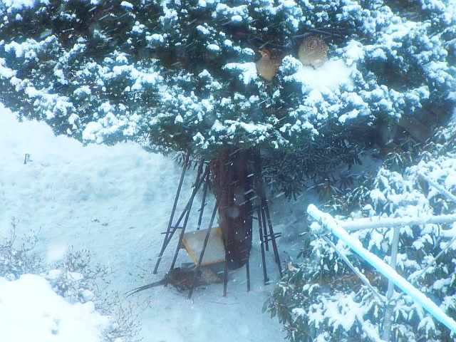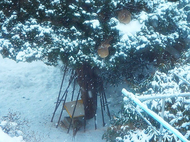 9時50分、小雪に中、遅ればせながらオスが中庭に到着し餌を食べ始めた。木の中からメス2羽が気配を感じて顔をだし、下のオスを眺めていたが、1羽のメスは近くの物干し