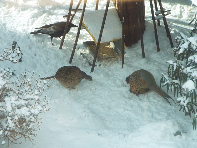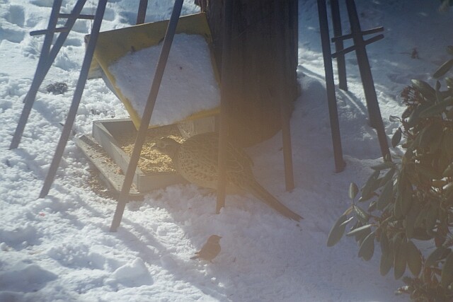 は、カラスの仲間とはいえ、小柄なミヤマカケス:左 がすぐにカラスの真上を飛んで果敢に威嚇した事だった。キジ達はしばらく気にしていない様子だったが、カラスが餌台に近付くとメスが鳴いて威嚇し、カラスを追い払った。右の写真では、カラスとキジ2羽が写っている。尾の長いのがオスのキジ。やはりキジの方が気が強く、カラスは終始おどおどしていた。やがてキジ達の食事も終わり、10羽ほどのスズメやカケスや他の小鳥が入り混じっての騒がしい食事が始まった。