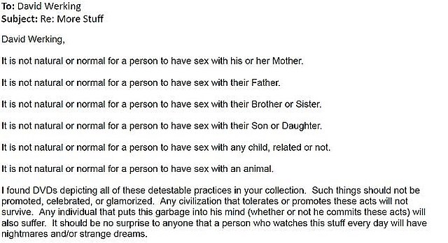 ワーキン氏が父親Paul Werkingと交わした複数の電子メールには、「ポルノが入った」箱12個と「アダルトグッズが入った箱2個」について記載されていた。同氏は1600個以上のDVDとビデオがあったと主張した。電子メールの1つでは、父親が息子に対し、「君のために全ての品を処分してやった」と書いてあった。両親の弁護人は判決を受け、損害賠償額を算定するため、ネヴァダ州のエロチック遺産博物館の専門家を雇ったと明かし、両親側は来年2月中旬までに損害の概要を裁判所に説明するよう求められている。