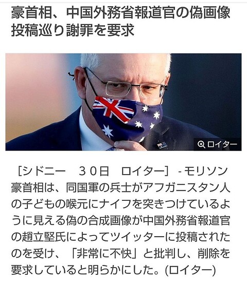 更に関係悪化に追い打ちをかけるように、中国外務省の趙立堅(ちょう・りつけん、ツァオ・リーチェン、ジャオ・リージエン:Zhao Lijian 赵立坚)・報道官が2020年11月30日ツイッターに、豪兵士がアフガニスタン人の子どもにナイフを突きつけている写真を掲載した。豪政府は写真は合成だとして削除と謝罪を要求。ところが、戦狼外交を繰り広げる中国政府は「恥じるべきは豪政府」だとして一歩も譲らないという事態も起きている。過去ブログ:2020年12月中国の「戦狼外交」に苦言を呈したEU駐中国大使