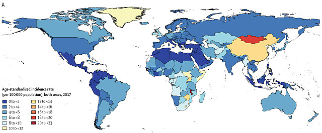 Gastroenterology&Hepatology」で発表された「世界の食道がんの半分は中国で発生している」とのデータ。195カ国・地域を対象とする最新の統計データで、記事によると2017年は世界で新たに47万3000件の症例が発生し、43万6000人が亡くなった。中国はそれぞれ23万5000件、21万3000人と世界のほぼ半数を占めたという。右図参照記事(図は2020年公表の1990~2017年の、人口10万人当たりの食道がんの発症状況で、標準発生率は5.9人、死亡率は5.5人だ。赤いモンゴルは18人から20人と率では最多発地域だが、総人数では人口の多い中国がトップになる)