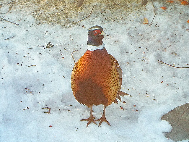 2020年12月24日:てっきりキジのメスは木の中に居ると思っていたが、朝8時半、オスが庭に飛んできて餌を食べ、10分ほど遅れてメスが東から飛来し、雪の上を小走りして食事中のオスと合流した。天気がいいので、飛び立っていたのだろう。食後、こっちを見ているオスに陽が当たっていたので写真を撮った。いつみても、地味なメスに比べ、オスの派手な色相には見入ってしまう。派手なオカマさんの化粧も顔負けである。気温は8度、快晴で無風。数日後には、また寒い日が来るようだ。