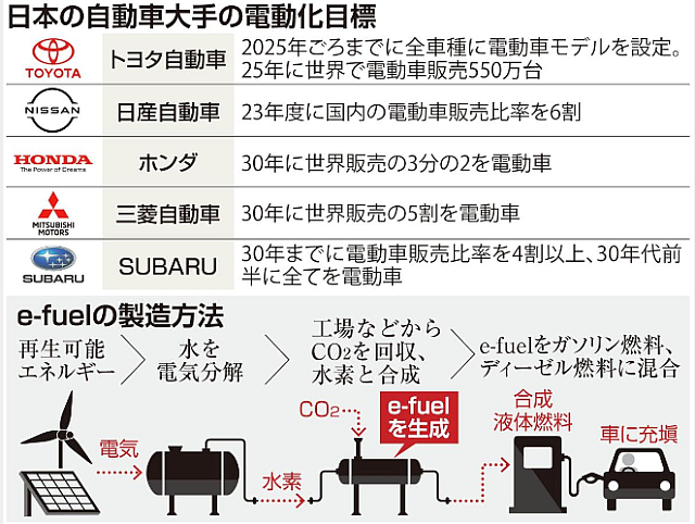 日本でもトヨタ自動車、日産自動車、ホンダの大手3社がイーフューエルの研究開発に本腰を入れ始め、実用化のめどはまだたっていないものの、自動車大手の担当者は「既存の車両やガソリンスタンドなどが使え、有益だ」と期待を寄せる。イーフューエルが大量生産できるようになれば、次世代を担う電動車の現実的な選択肢のひとつとして、日系メーカーが強みを持つHVはしばらくの間、実質的にCO2排出をゼロにした自動車と扱われ、存在しつづけることができる。また、ソニーなど他業種がEV参入の動きを強める中、自動車会社が次世代でも先行者としての優位を保つことができ、関連の下請けメーカーなどにも恩恵がある。