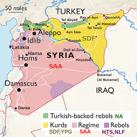 シリア北西部のイドリブ圏には、HTSを支援する組織として、トルコ支援のイスラム系反政府組織「国民解放戦線(NLF:National Liberation Front and other Turkish-backed jihadists」などが存在し、武装連合体としてシリア政府軍SAAと戦闘を今も継続しているが、複雑な反政府側は、仲間割れの戦闘なども起こしているようだ。上記地図の、緑色Turkish backed rebelsは、アラブ人民兵によるトルコの傭兵部隊「国民軍(NA:National Army)」で、シリア軍と手を組んだクルド人との戦闘を継続している。