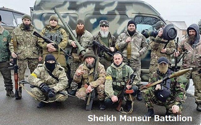 「シェイク・マンスール大隊」は、約20年前に、プーチン大統領らの弾圧よって、チェチェン共和国から亡命せざるを得なかったイスラム教徒などからなるイスラム系反ロシア組織で、 ウクライナ側を助けることで、「打倒ロシア」「打倒プーチン」を目指しているとみられている。この組織には、アゼルバイジャン、ジョージア、イングーシ人Azerbaijanis, Georgians and Ingush peopleも参加し、首都キーウ(Kyiv:キエフKiev)北東部で戦闘中とされている。英文記事 記録映像