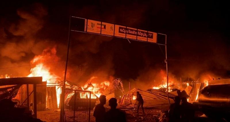 パレスチナ自治区ガザ地区の保健省によると、現地2024年5月27日、ガザ南部ラファRafahの避難民キャンプに対するイスラエルの26日夜間の空爆による死者は45人に増加し、負傷者は200人を超えた。イスラエルによる7回の空爆により、この24時間でガザ全域で66人が死亡したという。写真下:ガザ南部ラファのパレスチナ住民の避難区域で火災が起きた様子。