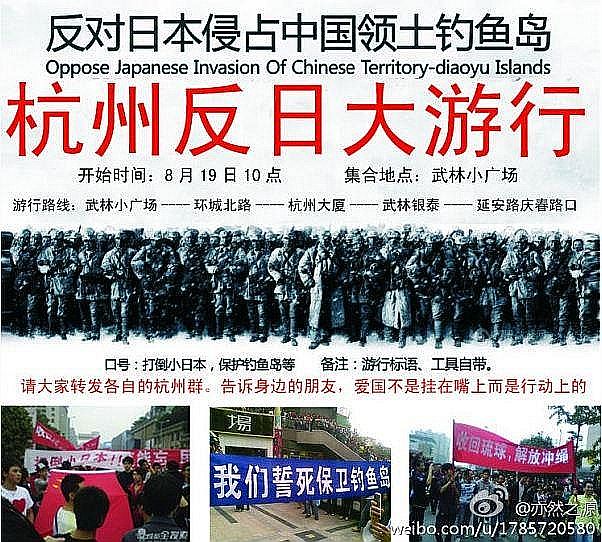 中国のデモが官製デモであることは世界中が気が付いている。こんな理由でデモに参加し、日本車を破壊し、日本食堂を破壊することがいかに馬鹿馬鹿しく、幼稚に見えることか。写真上は、ネット上のデモ参加への広告。参加者は、その意味も背景にいる共産党の存在も知らず、お祭り騒ぎに参加し、いっぱしの愛国者気取りということで、政治行動というには実態はあまりに情けない状況だ。他国のデモ活動は否定しないが、破壊や暴力に訴えないのがデモであり、取り締まりも無いのに暴れるのは無能なバカのすることだ。意思表示なら、他のやり方があるだろう。