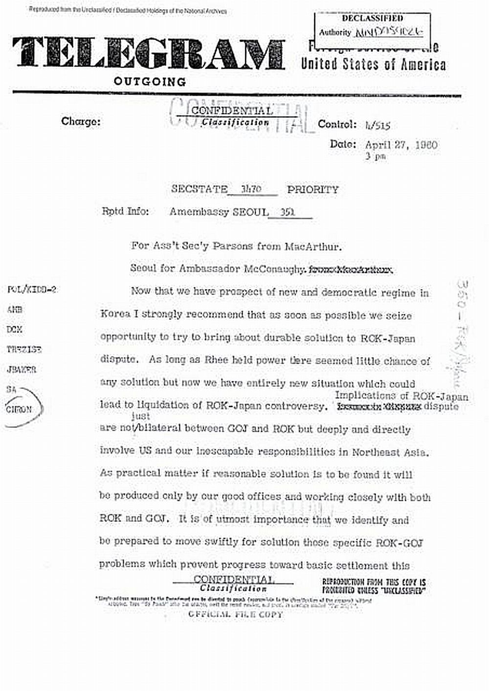 1951年サンフランシス条約で領土が最終確定するが、その前から米軍は、1950年の朝鮮戦争での必要から竹島付近を海上爆撃演習場として使用し、サンフランシスコ条約後の1952年には、竹島の演習場としての継続使用を日本政府に公式に求め、政府はこれを日米行政協定に基づき承認もしている。 竹島の歴史:日本語版(PDF)