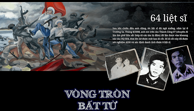 が占領し続けている。ベトナム海兵隊員64名が犠牲になり、後に3名だけが遺体で見つかったが、61名は遺体すら見つからなかった。2008 年夏、ベトナム海軍の代表派遣団は、20年前の中国の侵略からベトナムの神聖な海と土地を守った英雄たちに心からの敬意を捧げるために式典を行った。犠 牲になった水兵と士官を思い出すために、タバコ、チューインガム、水兵の過去の日用品と花輪を海に流した。式典は1988年の中国の侵略以来、毎年実施さ れてきた。犠牲になった人たちを思い出す中で、彼らが祖国防衛のために手をつないで壁を作ったあの時の戦友のイメージが甦ってくる。