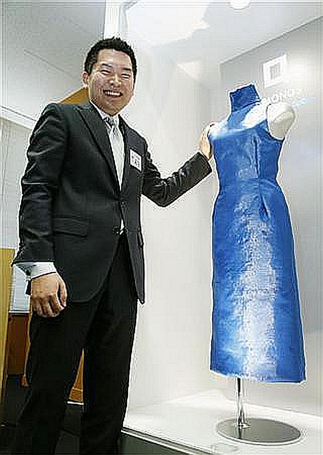 Fiberを生産可能な試作研究プラントを立ち上げ基礎検討を進め、2015年に月産10㌧まで生産できるパイロットプラントを竣工、稼働させる計画だそうです。右は試作されたドレス。参照記事 参照記事 *質量当たりの強度比較なら、クモの糸だけでなく、ナイロンなども鋼鉄より遥かに強い