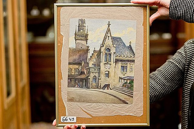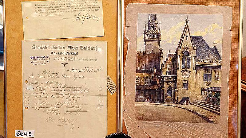 この水彩画はミュンヘン(Munich)の役場を描いた1914年の作品"Standesamt und Altes Rathaus Muenchen" ("Civil Registry Office and Old Town Hall of Munich") で、大きさは縦28センチ、横22センチ。出品者である70歳代ドイツ人の姉妹は、ヒトラーが20代だった1916年に祖父が購入したものだとし、収益の10%を障害を持った子供へ寄付すると発言している。若い頃に駆け出しの画家だったヒトラーはウィーン美術アカデミー(Academy of Fine Arts Vienna)を受験したが、合格しなかった。ただ、自身が観光客に売っていた絵葉書を模写するという形では絵を描き続けた。