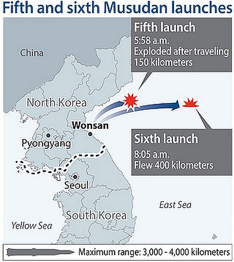 軍基地のある米領グアムに到達できる。しかし実際には、最大飛行距離が試されたことはない。最近数カ月に実施された合計5回の発射実験のうち4回は失敗している。北朝鮮の東側の海岸から発射された22日の実験では、1発目は約150キロを飛び、海に落ちたとみられる。累計で6回目になる2発目の実験は1発目の数時間後に実施され、少なくとも水平距離で400キロ飛び、高度1000キロまで上昇したことから、長距離弾道ミサイル技術の核心となる大気圏再進入(re-entry)技術もある程度確保したのではという観測もある。今後、射程距離が最大1万2000キロの3段式大陸間弾道KN-08ミサイルの発射を試みる可能性が高いと韓国側は語っている。 参照記事 英文記事 参照記事