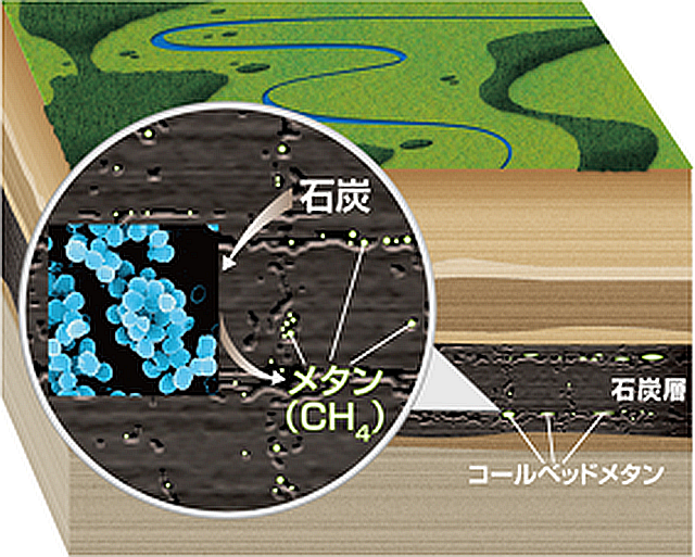 サイエンス電子版に発表した。これまで、酢酸やメタノールを原料にメタンCH4を作る菌は知られていたが、石炭から生成できる菌は初めてという。産総研は「将来的には天然ガスの増産技術の開発にもつながる可能性がある」とし、新たな資源として注目されている地下の石炭層に含まれる天然ガス「コールベッドメタン:CBM(Coalbed Methane)、炭層メタン: 石油より安価で、石炭より二酸化炭素の排出量が少ない天然ガス。」の生成にも同じような働きを持つ菌が重要な役割を担っている可能性がある。つまり、炭層メタンの発生原理はいまでも正確には未解明ということのようだ。一般にメタン生成菌は嫌気性菌なので、今後の研究によっては、石炭採掘が不可能な深度に注入してメタンだけを採取することが可能になるかもしれない。CBMは石炭の小さな穴(微細孔隙)に溜まったメタンガスのことで、「炭層メタン」とも呼ばれる。かつては炭鉱採掘時に爆発事故の原因となる厄介ものだった。CBMは石炭層に含まれるため、石炭が採れる場所であればCBMを採掘できると考えられ、ロシア、アメリカ、中国、オーストラリア、カナダ、インドネシア、南アフリカの地下にはCBMが眠っていると有望視され ており、採掘が始まっている。わずかながら、日本でもCBMの採掘が期待されている。石油に圧されて国内の炭鉱はほぼすべてが閉山となっているが、ガスを多く含むとされる北海道 の石狩炭田において、有望視される3カ所の資源量が調べられたところ、240億立方メートルと推定された。