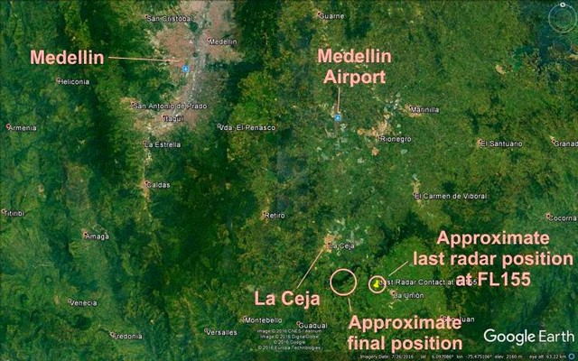原因は不明だが、燃料切れとも、10時ころの電気的なトラブルの緊急連絡後にレーダーから消え、 La Ceja近くに墜落したとの記事がある。コロンビア空軍がヘリを急行させたが視界不良で引き返し、その後の報道で6名が生存、また、10人が救出後手当てを受けているとの報道もある。事故機には、乗客72人のうち、48人のチームメンバーと、少なくても21人のジャーナリストが乗っていたとされ、また、少なくてもチー