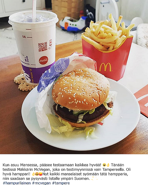 マックビーガンは、バンズに大豆パテとトマトやレタスなどを載せ、卵を使わないサンドイッチソースを使ったハンバーガー。フィンランドでは2017年10月にタンペレTampereなど地方都市の少数の店舗で試験的に期間限定で