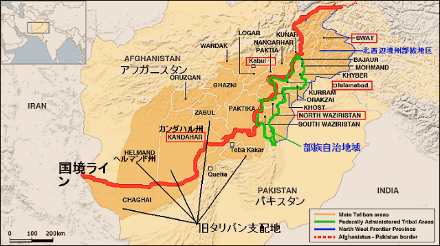 れた。しかし13日には、検問所で5人のアフガン兵士が殺害され、5人が誘拐されたと報告されている。最近1週間で同地域では、政府側兵士38人が殺害されたとの記事もある。 右図の赤い部分が2018年2月のタリバン支配地域で、ISは東部やカブール周辺に点在し、アフガンの約70%の地域でタリバンが活動していると言われる。参照記事 参照記事 参照記事ヘロインheroinからの収入を資金とするタリバンは、密輸ルートにファラー州を抜けてイランへのルートを使っていると言われ、これが西部への進出の理由とも言われている。11日には東部ナンガルハール州Nangarhar provinceで爆弾テロが起き市民5人が死亡したが、犯行声明は出ていない。政府側は和平協議への参加をタリバンへ打診しているが進展は見られていない。 過去ブログ:2018年2月アフガンのタリバン制圧へシフトする米軍