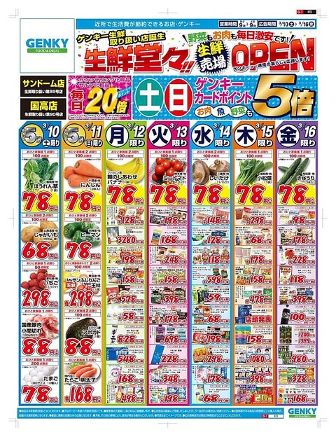 ドラッグストア「ゲンキー」を展開する福井地盤のGenky DrugStoresは肉や野菜、果物を取り扱う店舗を現在の約90店から18年12月までに全店に相当する約210店に広げる。生鮮品を取り扱い始めると店舗の1月あたりの売上高が25%増えるなど、成長が見込めると判断した。日本チェーンドラッグストア協会(横浜市)の調査によると、17年度のドラッグストア全店売上高は17年連続のプラス成長となる見込み。特に食品の売上高が1兆5500億円で前年度比8.5%増と大きく伸びた。食品は各社が成長分野とみて取り扱いを増やしている。九州地盤のコスモス薬品では既に、食品の売り上げの構成比率が約56%に達している。