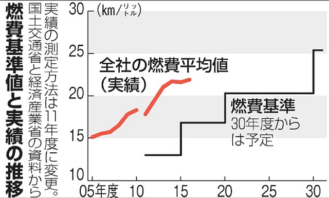 政府が2011年にまとめた現在の基準では、2020年度までに今の燃費測定方法で1リットルあたり20・3キロ(新基準の測定方法で17・6キロ)の走行距離を求めている。ハイブリッド車(HV)など低燃費車の普及で、すでに前倒しで達成されたため、厳しい基準をつくってさらなる二酸化炭素(CO2)排出量の削減を進めることにした。求められる燃費は現在の基準からは44・3%向上することになる。これまでの対象はガソリン車やHVが中心だったが、新たに、今後出荷台数が増えると見込まれるEVやプラグインハイブリッド車(PHV)も加える。参照記事 参照記事