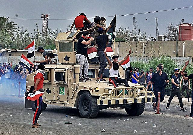 リハール広場Tahrir Squareのデモ隊、左は、分捕った治安部隊の装甲車に乗るバスラBasraのデモ隊 バスラでは、治安部隊がデモ隊から手榴弾の攻撃を受けたと報道されている。イラク内務省は「複数の州で、政府系庁舎や各政党の拠点・事務所が複数のグループによって放火された」と発表し、バグダッドでは機動隊に向かって発砲していた1人が逮捕された。ている。 参照記事 英文記事 英文記事 英文記事 参照記事 過去ブログ:2019年10月イラク市民デモの死者109人以上 国連懸念を表明コメント